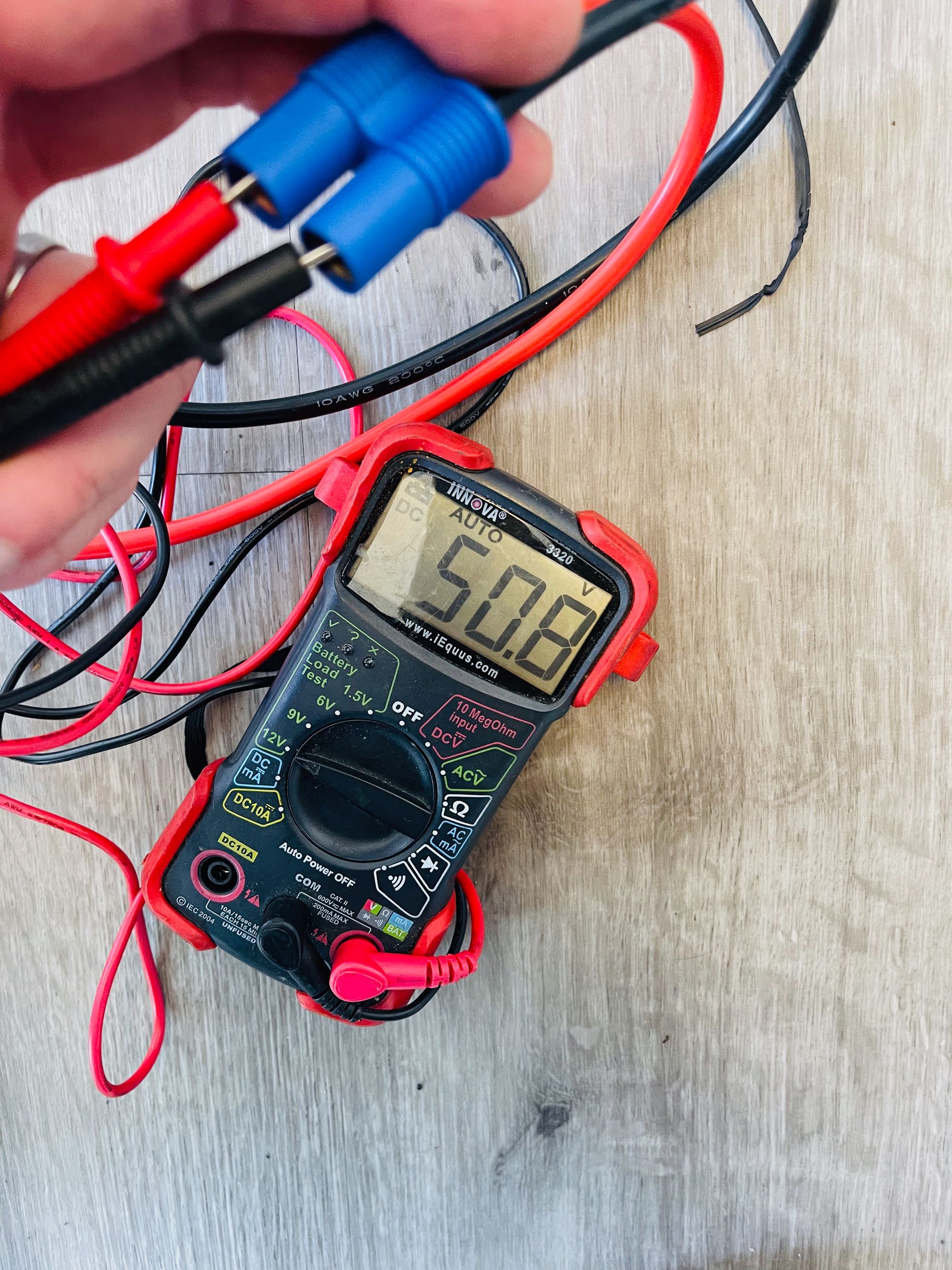 I've set the solar panels up in a series-parallel configuration, with one panel facing east, and one west. Each panel is rated to put out a max of 24v. Since the solar panels won't put out any juice if there's not enough sun to produce at least 12v, wiring them up in this way means they're putting out 50v at full sun – but it also means that I can get more morning & evening sun, because by doubling the voltage, I'll get above 12v in the morning/evening for more of the daylight hours than I otherwise would. Here's a pic of the setup, including the 50v output: