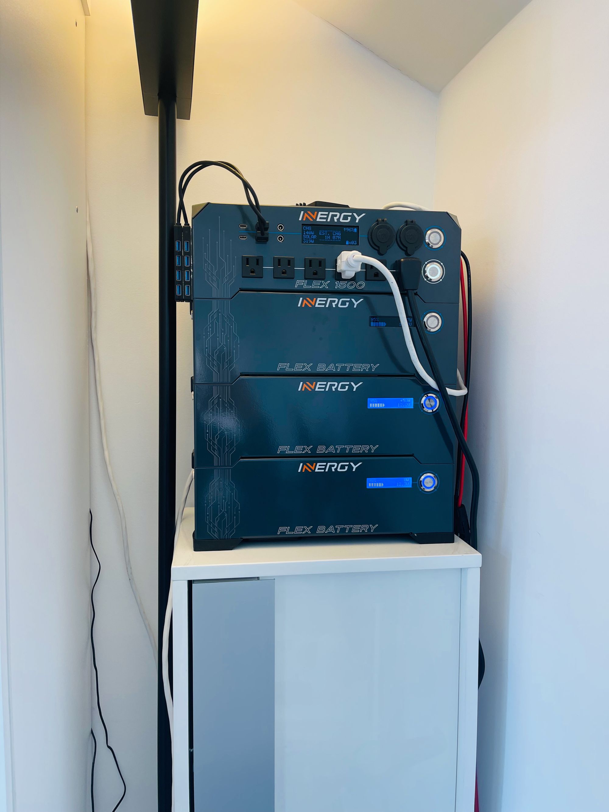 I'm using the Inergy Flex 1500 setup in my Sprinter, with a 200 amp hour battery capacity, which has been flawless. I posted a bunch about building that system out here on my sprinter build thread, and it also made an appearance in this Inc YouTube video on distributed work.