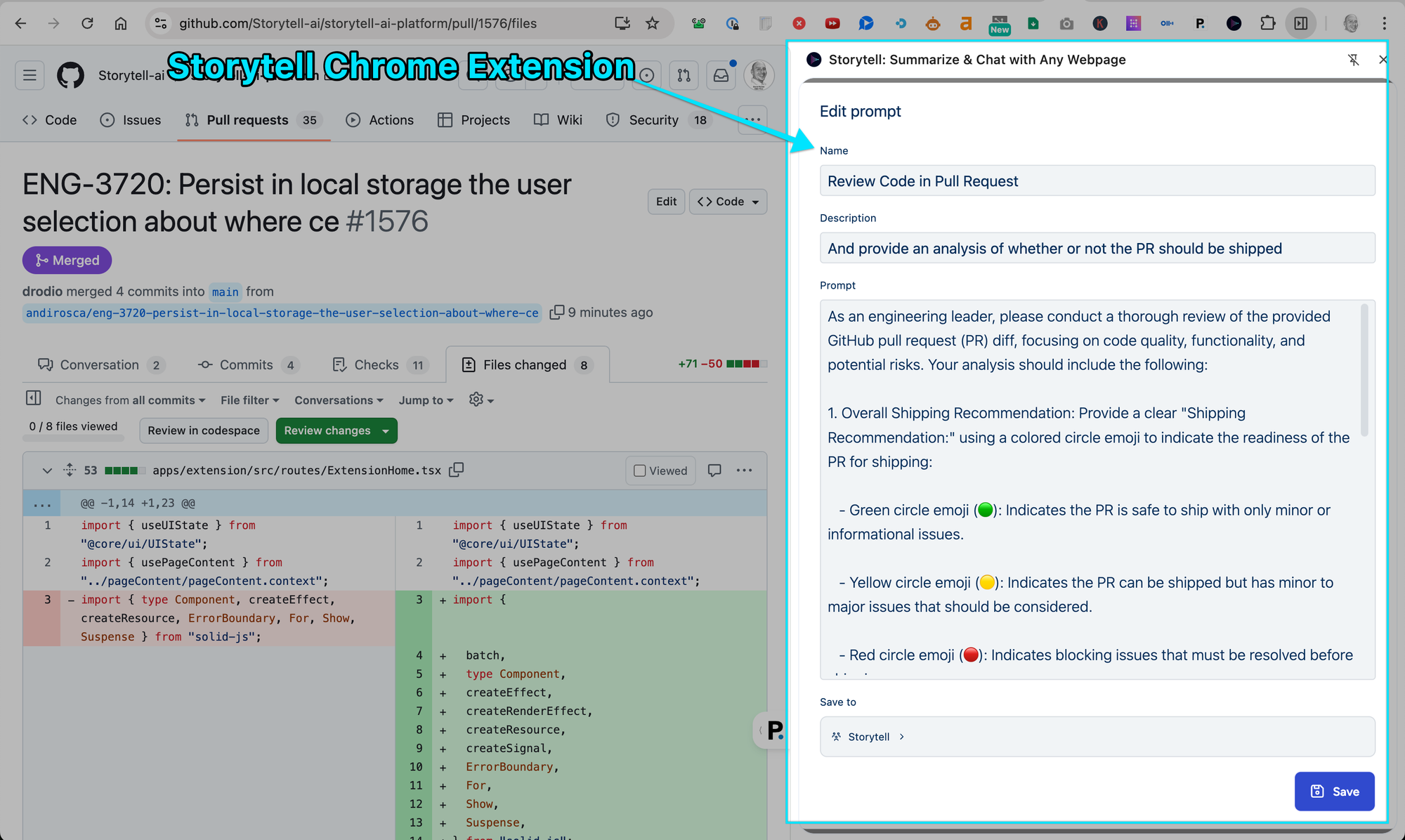 - I then open the Storytell Chrome Extension on the Github PR page and run the prompt.