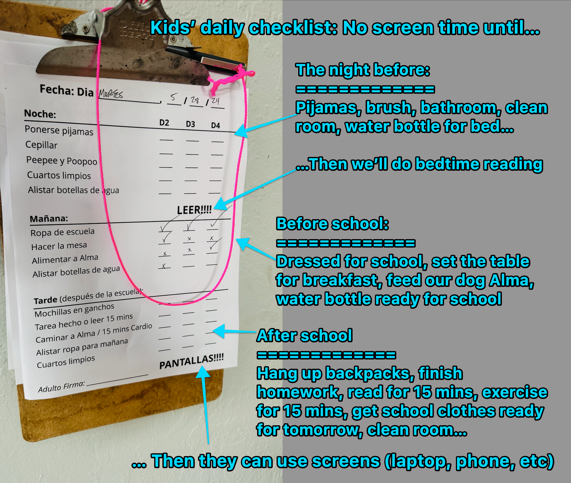 - I got a great tip from fellow dad to create a daily checklist before the kids can get on devices. I've implemented it and can vouch for its effectiveness. In our household, the checklist is: