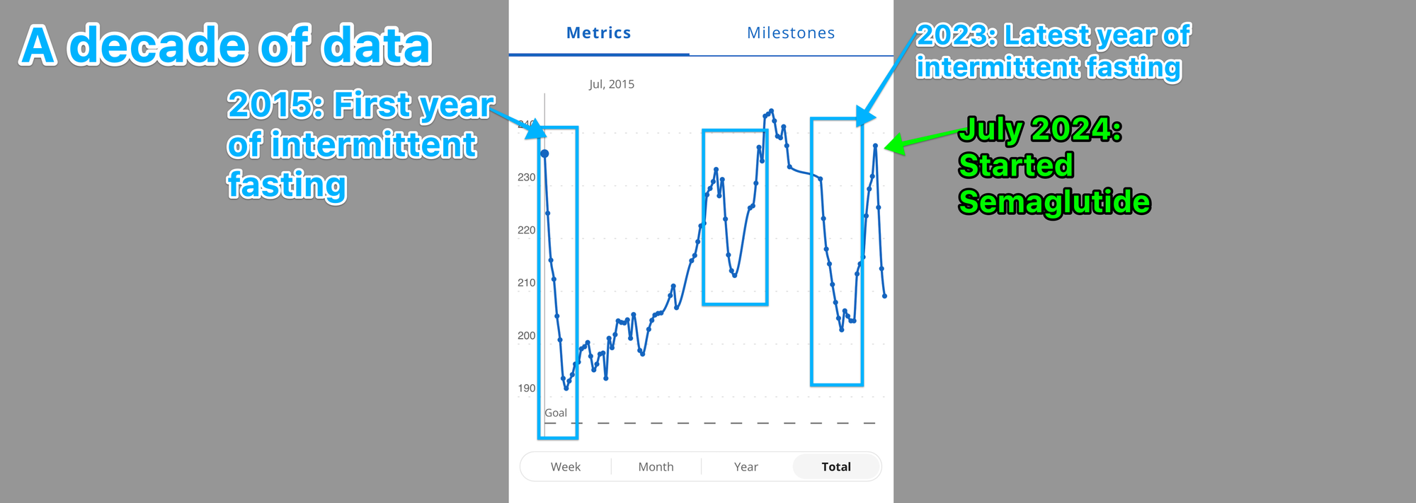 I've tried many strategies to feel like I'm in control of my body and achieve a target weight, from rowing 1,000,000 meters in 8 months to fasting every other day in 2023, being in ketosis for 2 years in 2017 (and going down the exogenous ketones rabbit hole)... even starting an intermittent fasting journey a decade ago in 2014.