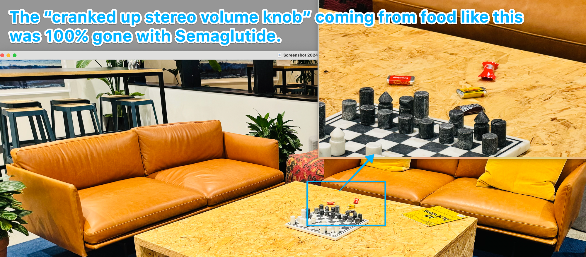 Semaglutide turns the volume down. To maybe a 2 or 3 on a scale of 10. It's incredibly freeing not to have that stereo blasting nonstop at 11. I first noticed this right after starting Semaglutide when I was walking by a table at our office WeWork where someone had left a few pieces of candy on the table. In the past, I would've mindlessly scooped one of them up and popped it into my mouth. But as I looked at them on the table, I realized that the food looked exactly the same to me as the chess pieces on the board. There was no stereo volume knob cranked up to eleven. It was the very first time in my life that I was able to feel that way.