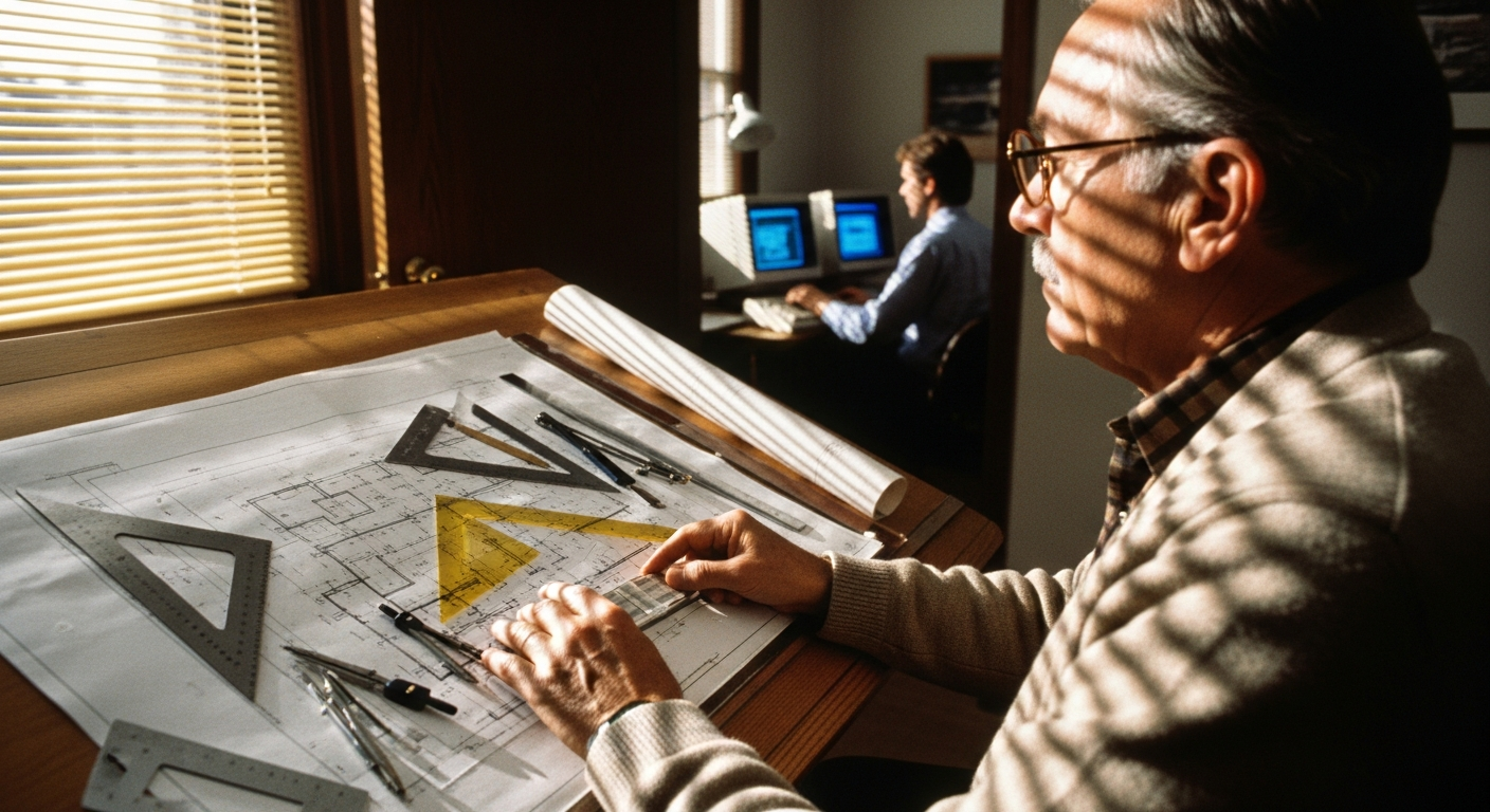 It's 1985. You're an architect who spent your career learning to draft by hand. You can draw a perfect circle freehand. You know building codes by heart because you've hand-lettered them onto blueprints a thousand times.