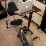 I've recently set up a pretty sweet work station - on a recumbent bike! I've found that yes, I can in fact work while biking (how sweet is that to those of you who, like me, value every minute of work time!). I can burn about 500 calories an hour doing this.